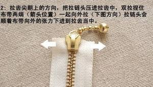 2、拉齒尖朝上的方向,把拉鏈頭拉進(jìn)齒中,雙拉捏住布帶兩端一起向外拉,拉鏈頭會(huì)順著布帶向外的張力下進(jìn)到拉齒中。