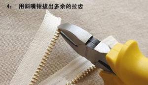 先用打火機(jī)燒下剪裁的布帶邊,防止脫落。拉齒尖朝上方向,把拉鏈頭拉進(jìn)齒中,雙拉捏住布帶兩端一起向外拉,拉鏈頭會(huì)順著布帶向外的張力下進(jìn)到拉齒中。布帶拉出后就可裝上拉頭。用斜嘴鉗拔出多余的拉齒。安裝上下止即可。具體步驟如下:
